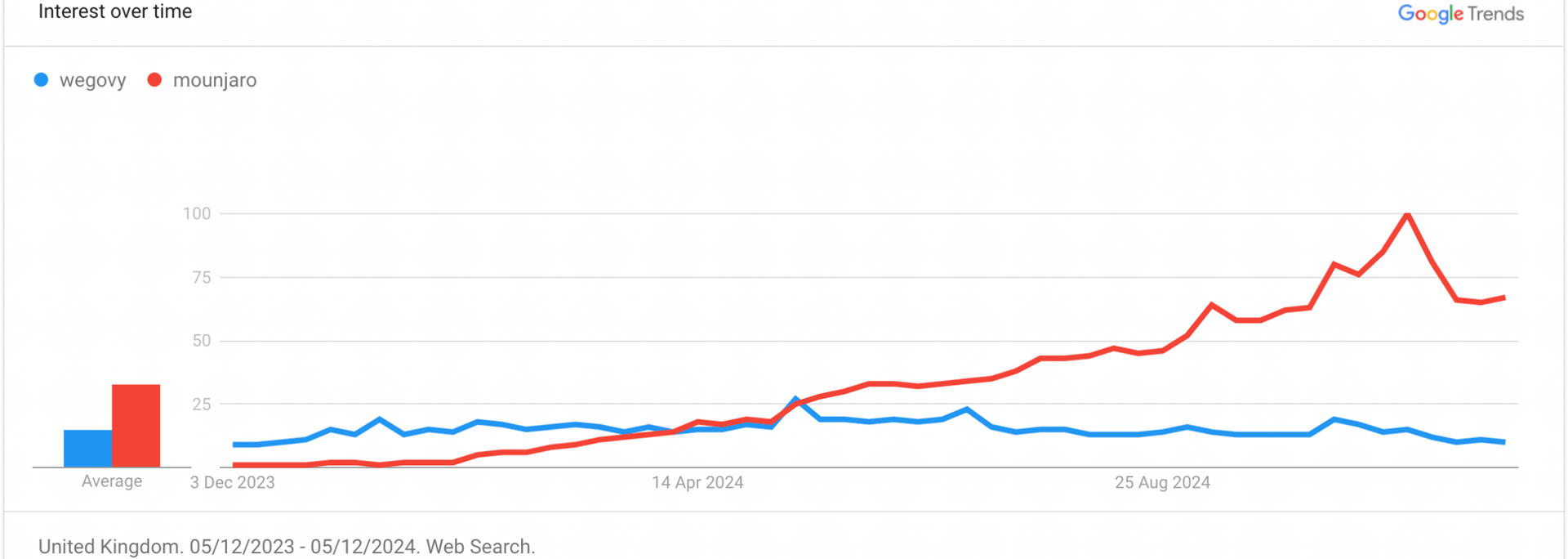 But while both medications have won their fair share of headlines, Mounjaro has begun to dominate the conversation. As this Google Trends graph shows, search interest started to shift in April 2024 – and now, interest in Mounjaro far outweighs interest in Wegovy.